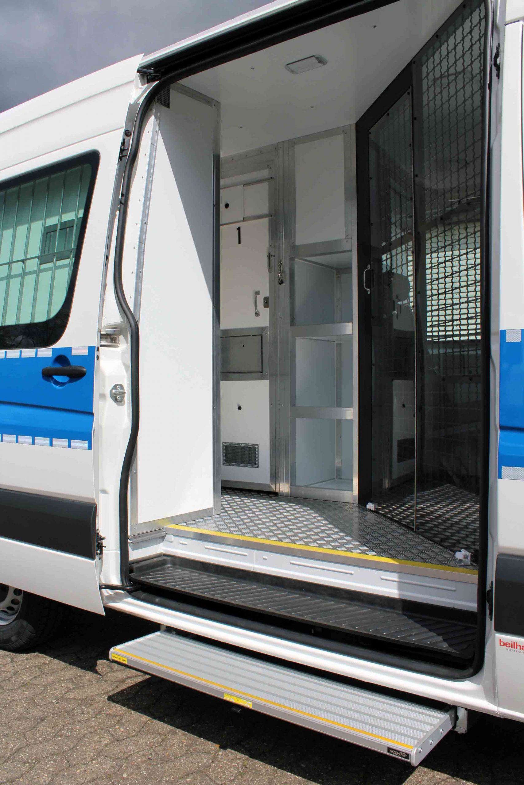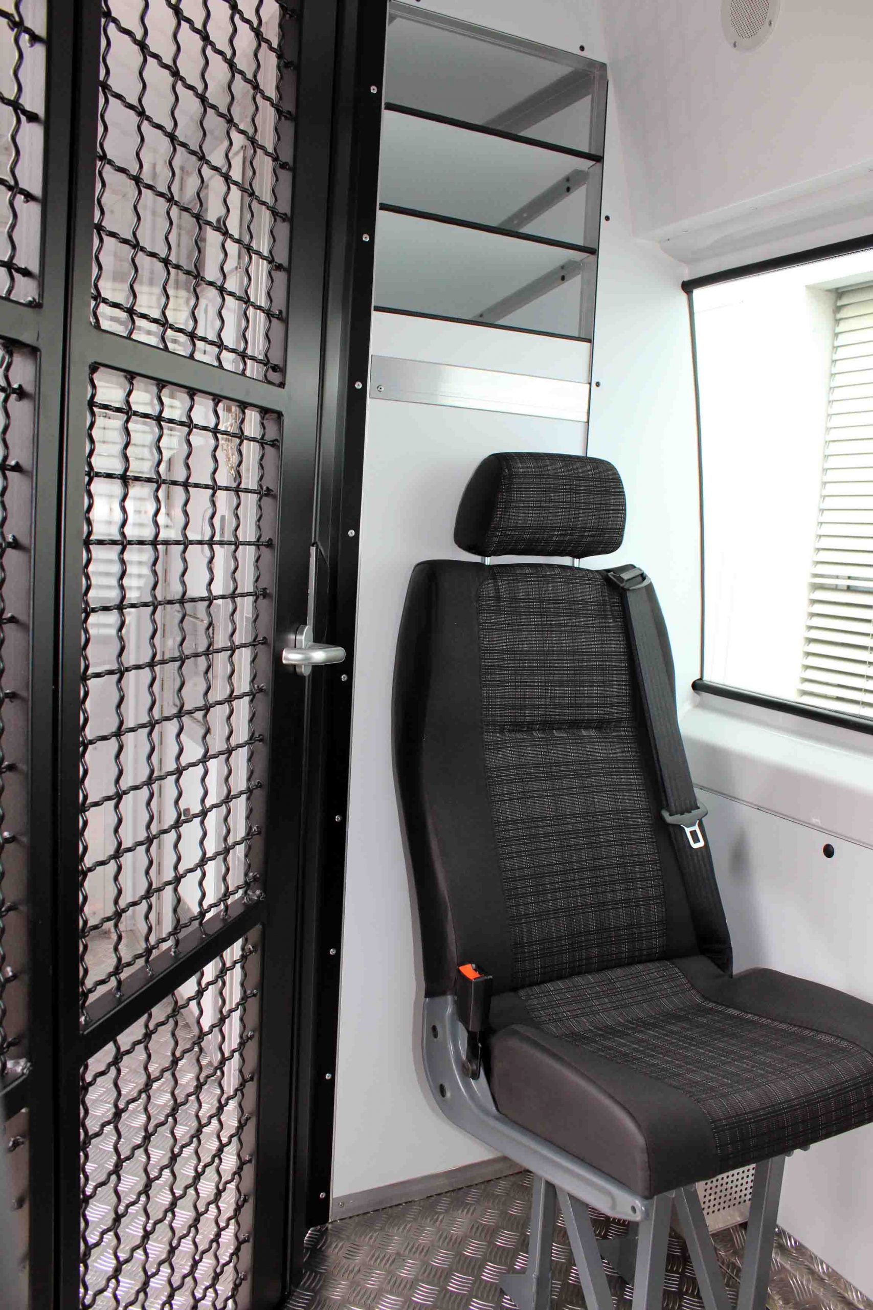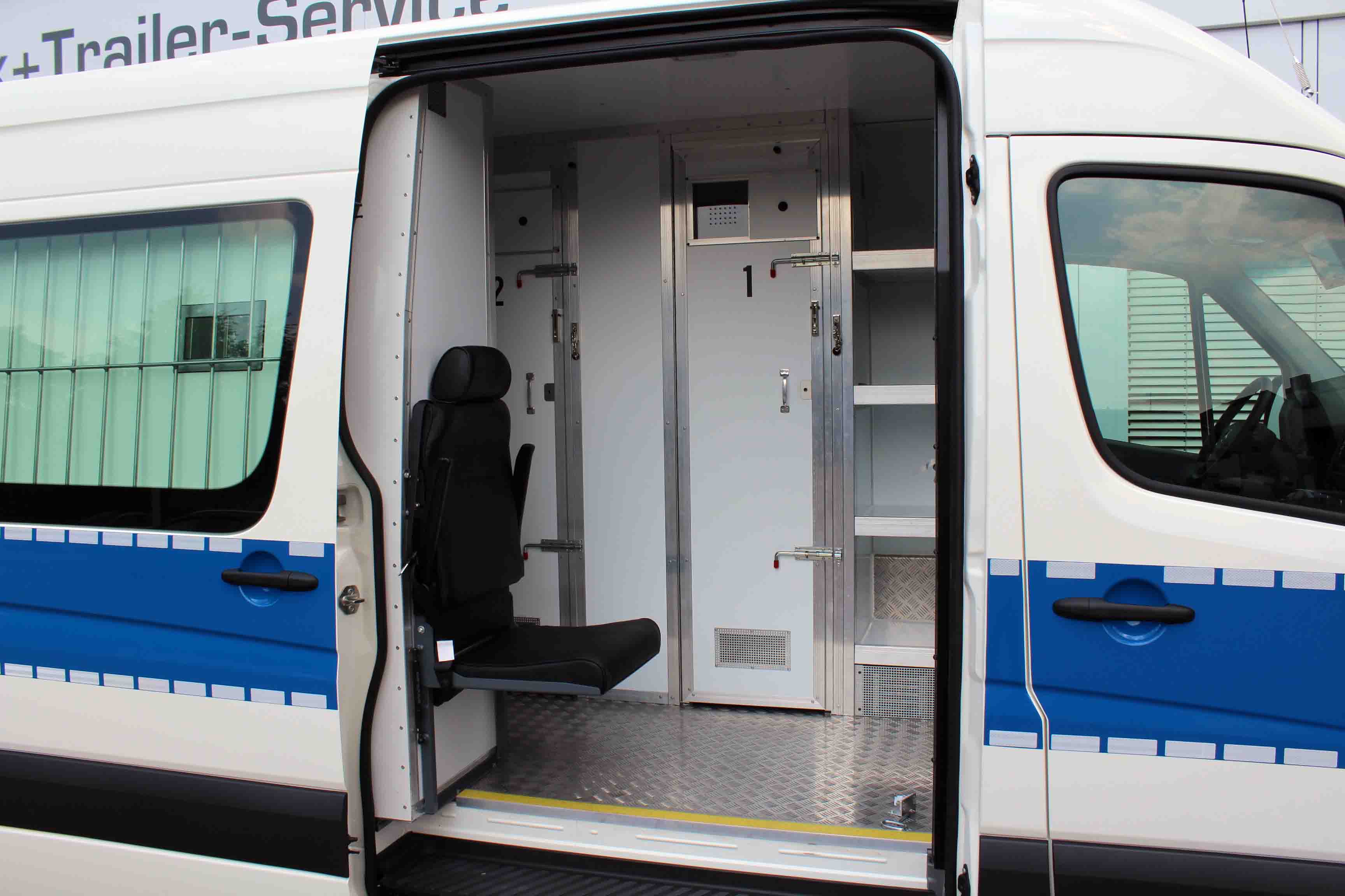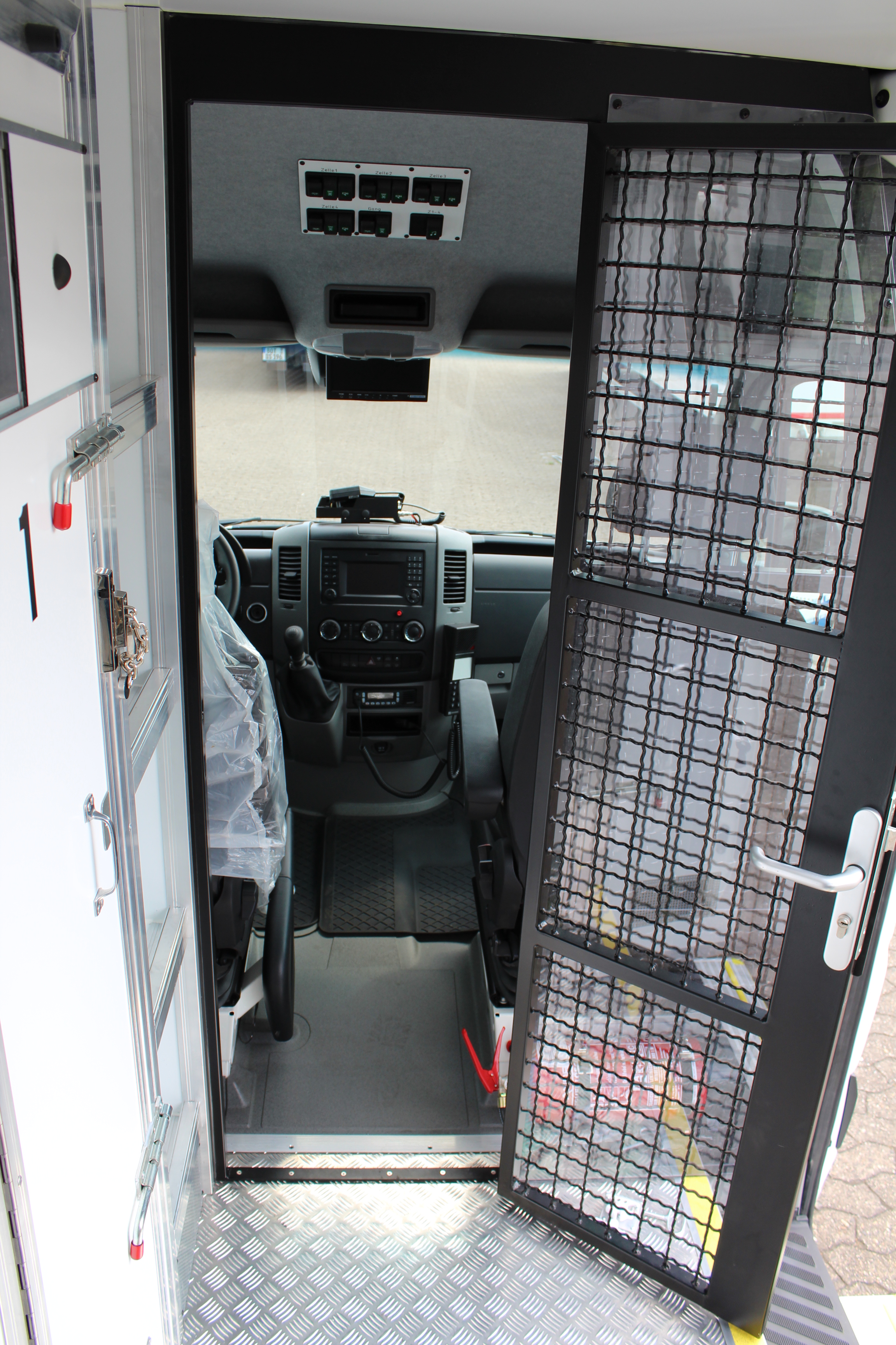 Platz für 3. Begleitperson. Staufächer im pberen Bereich. Trennungstüre zum Zellenbereich.