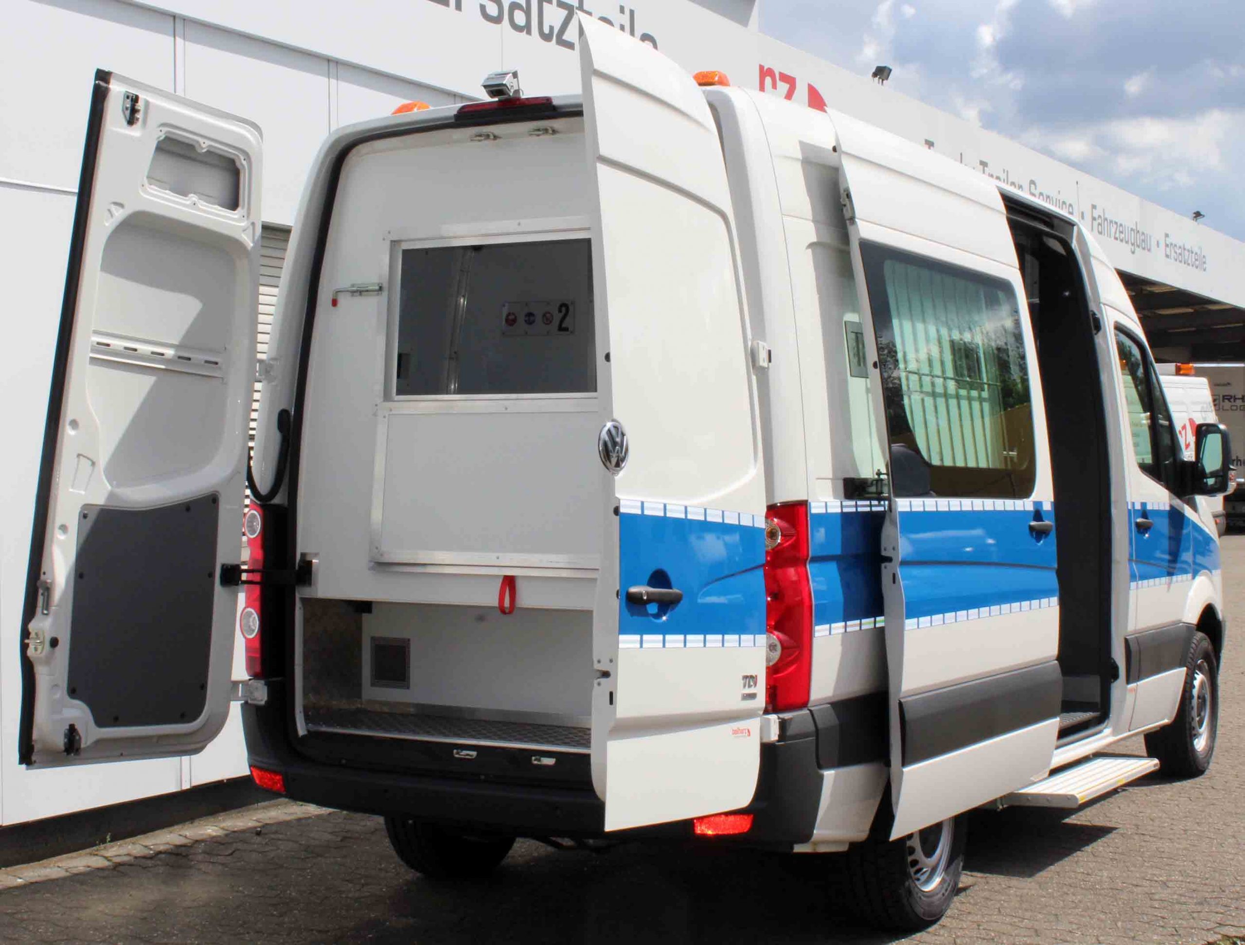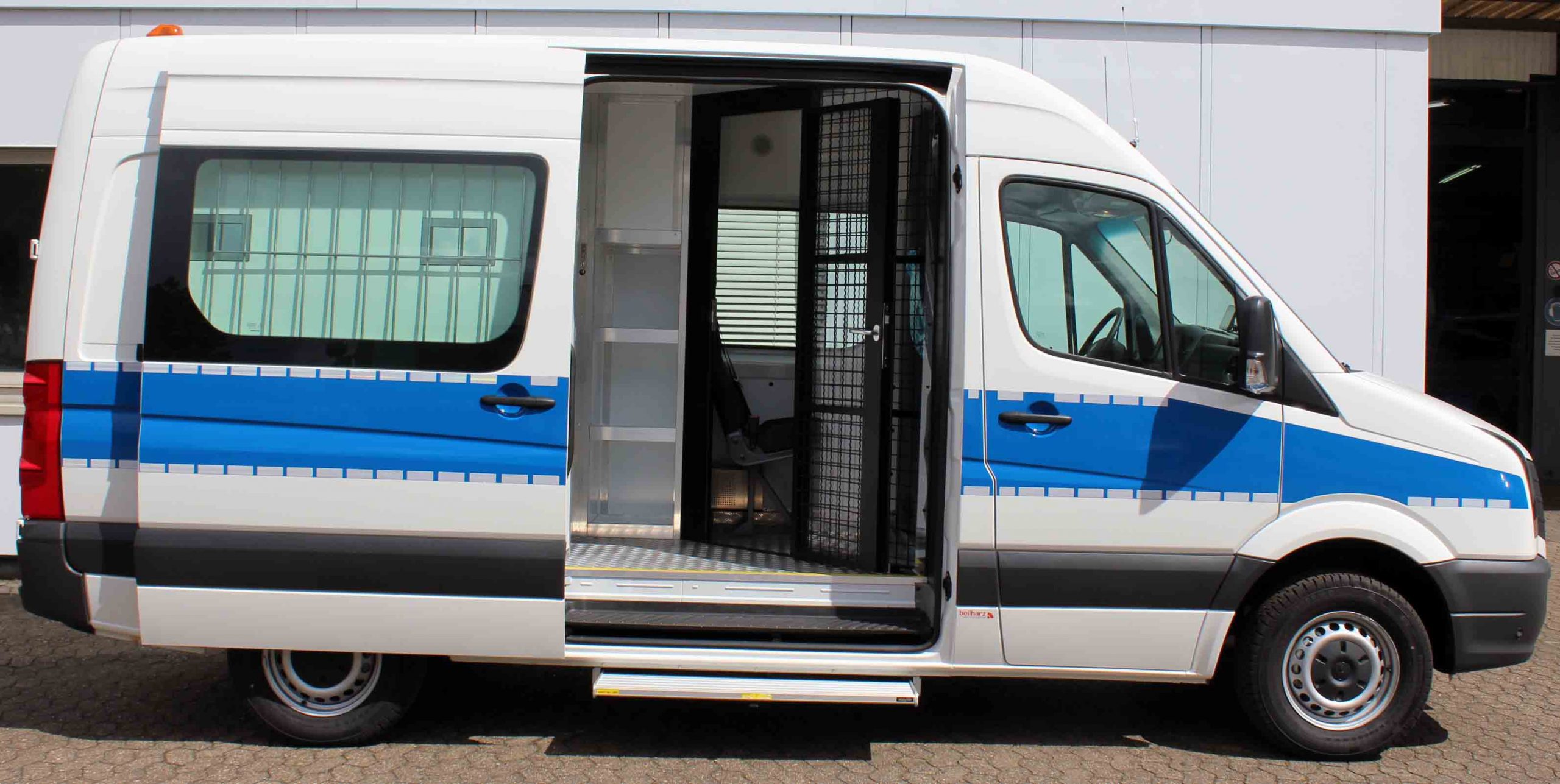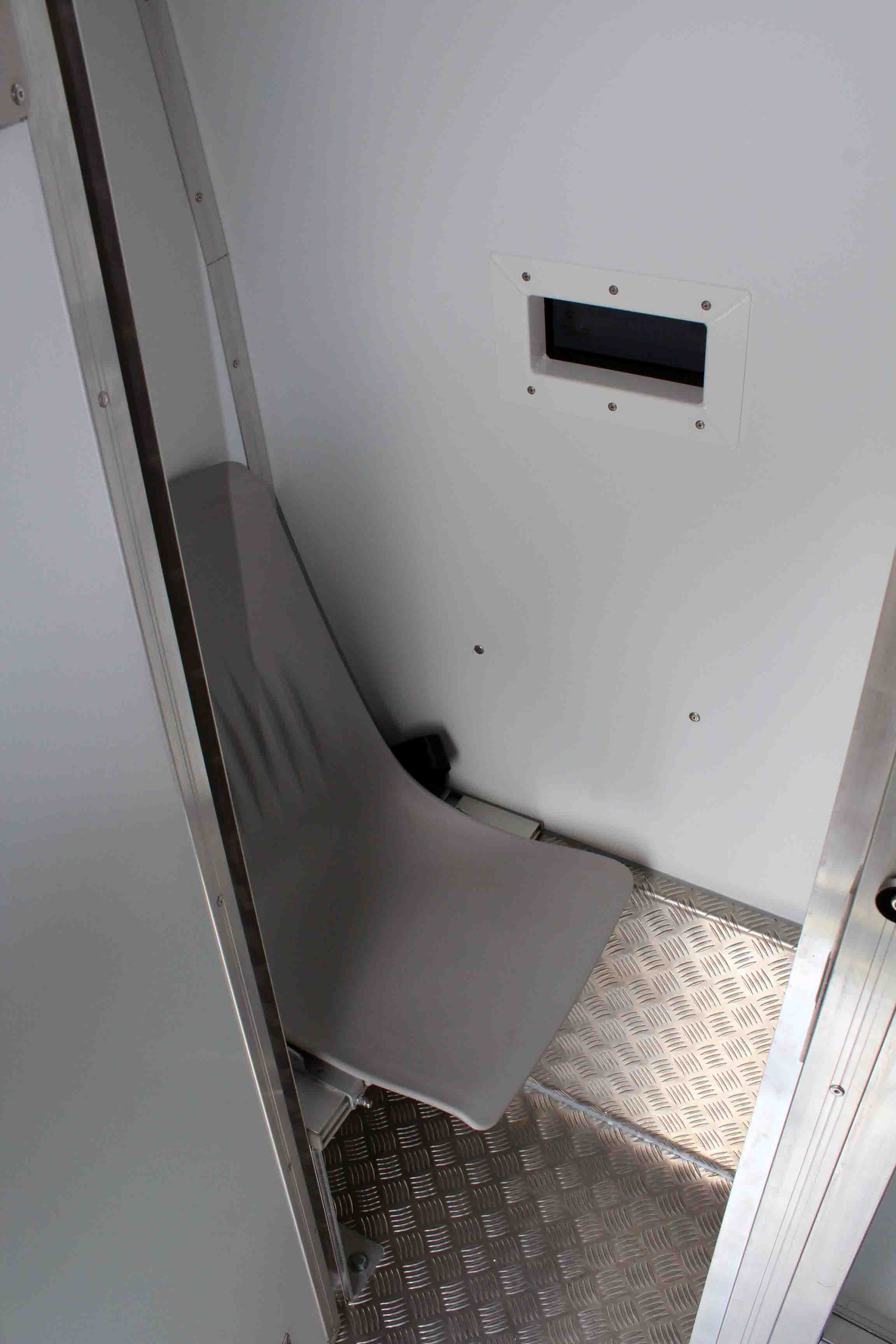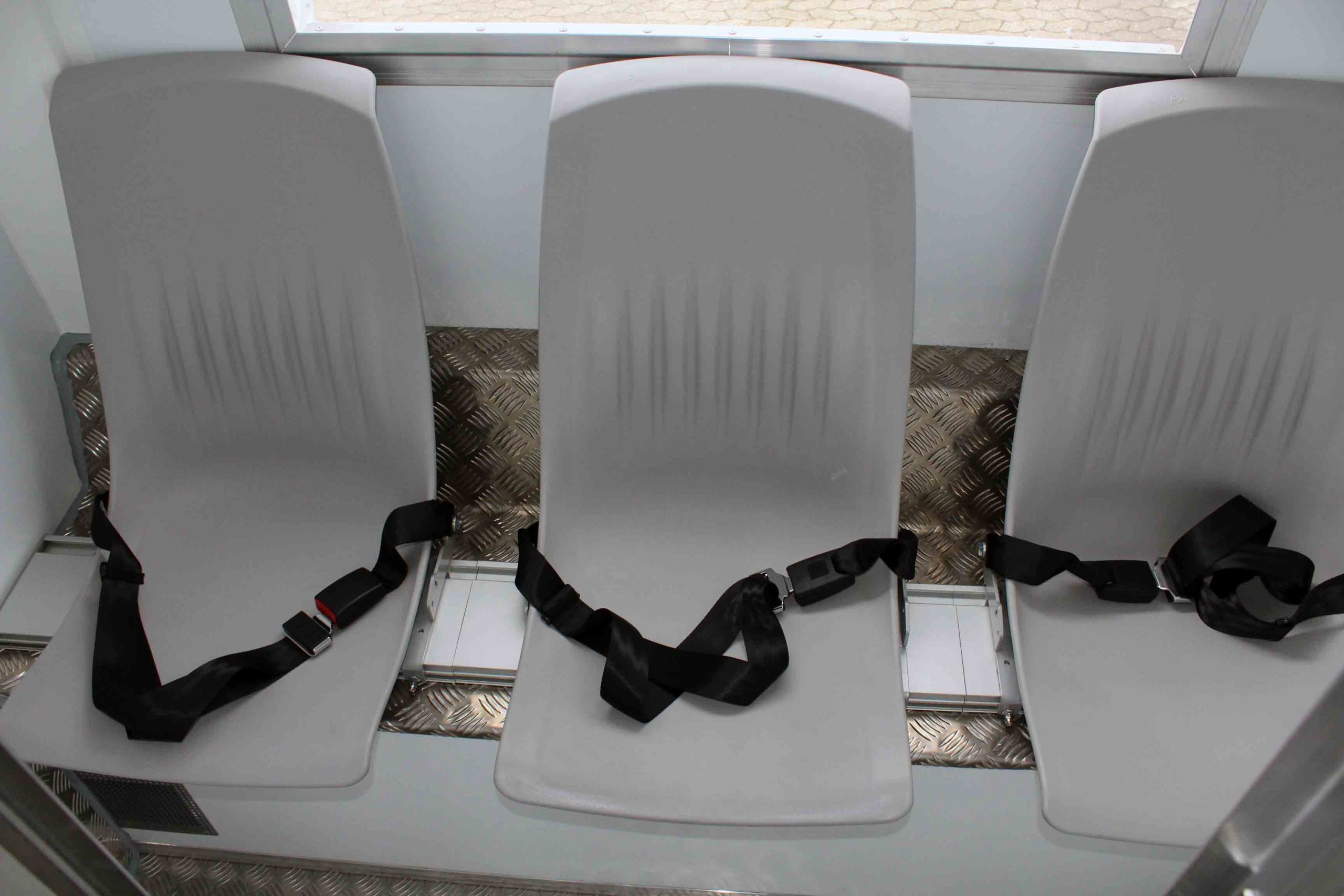 Platz für 3. Begleitperson. Staufächer im pberen Bereich. Trennungstüre zum Zellenbereich.